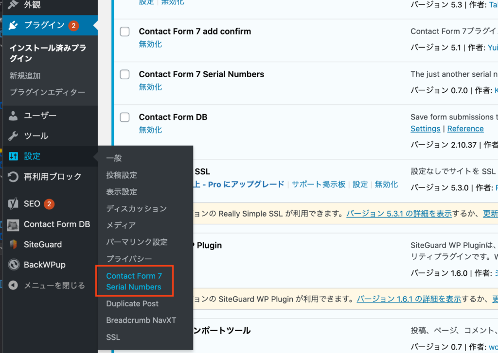 プラグインが有効化できたら、画面左のメニューの「設定」の中に「Contact Form Serial Numbers」というのが追加されていると思います。