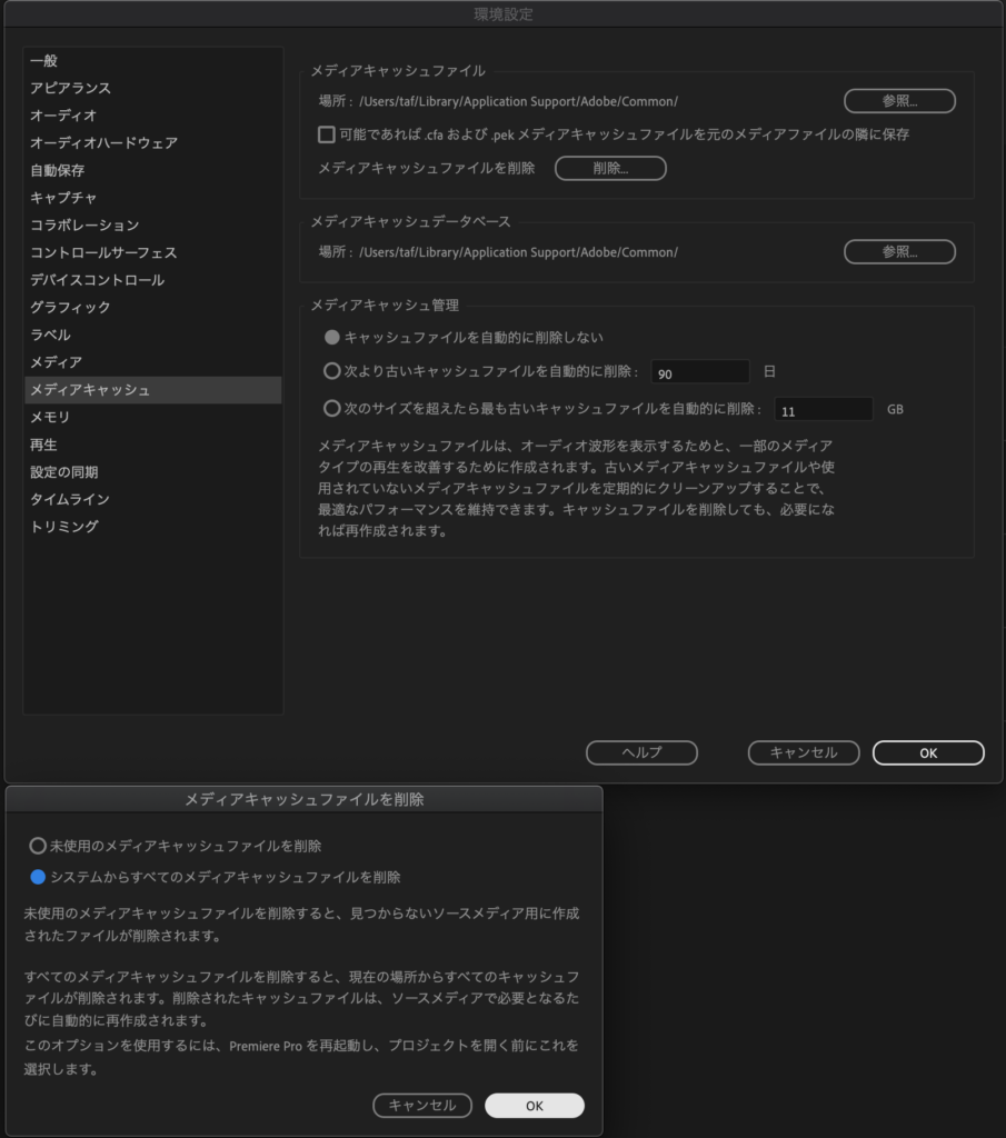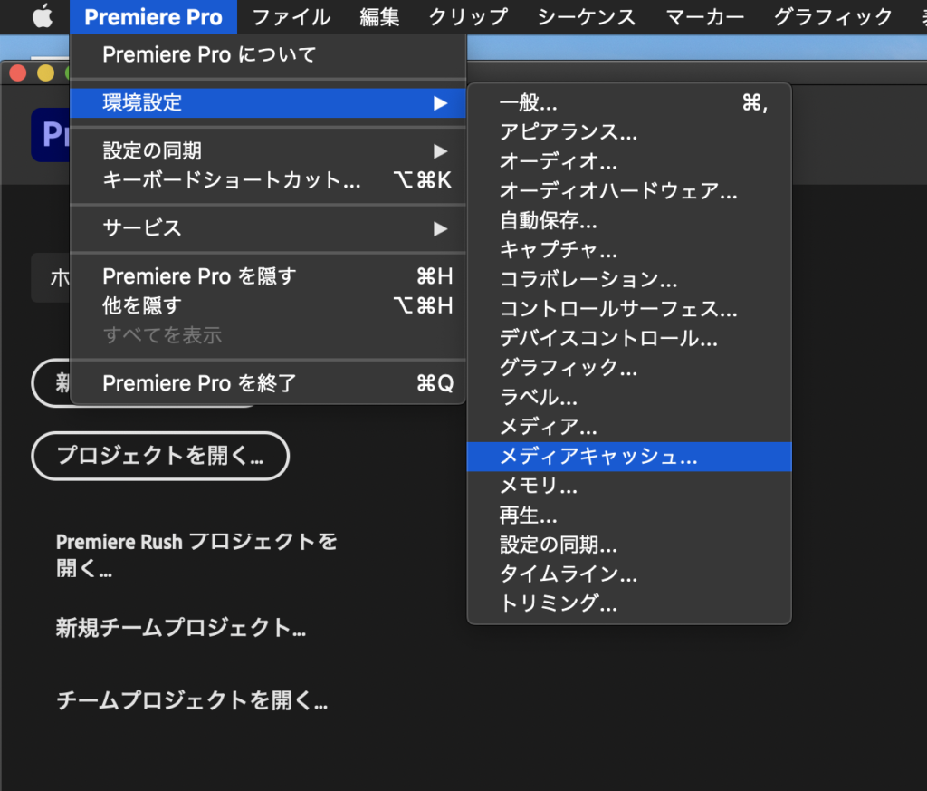 まずはPremiere Proの編集から「環境設定」「メディアキャッシュ」を開きます。