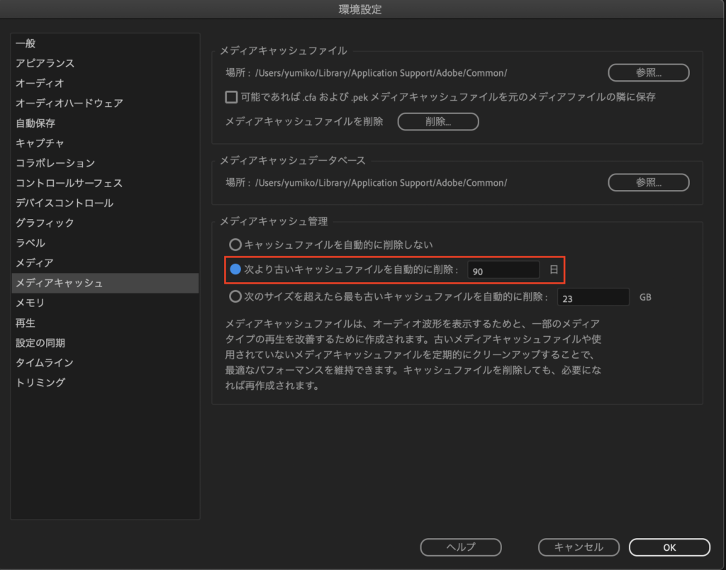 Premiere Proの環境設定の「メディアキャッシュ管理」から、ある日数や容量を超えると自動的に削除する設定にすることができます。